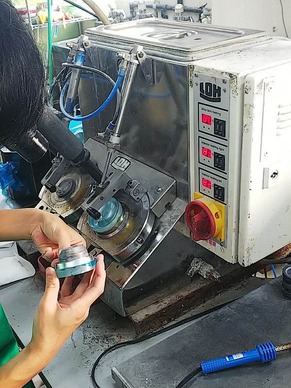 原料が固ったら、完成したプラスチックレンズを鋳型から取り出し、“焼き戻し”をする。